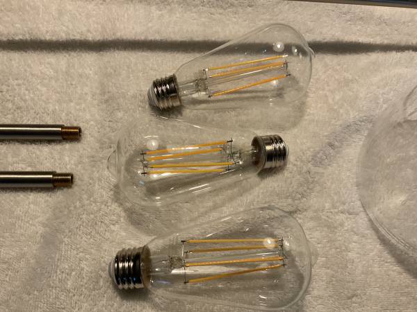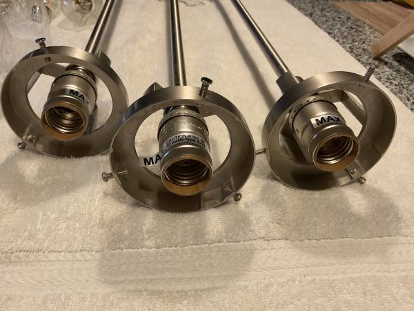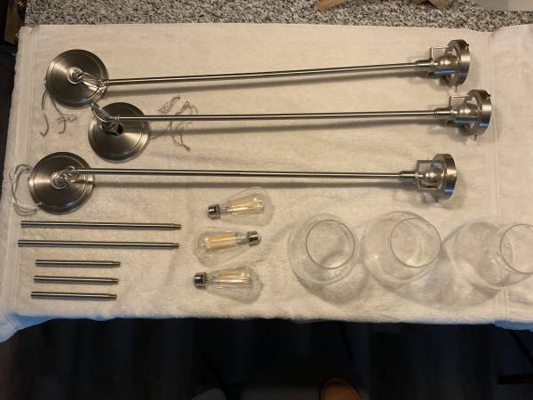 These came with my new home about 16 months ago, 3x Belton brushed industrial nickel finish hanging mini pendant lights. In perfect condition, including glass globes. 32 inch length as they appear in photos, included are extra 2x 12-1/2” stems and 3x 6-1/2” stems. Glass globes dimensions are 5.375” D, 6” H. Bulbs are included (E36 base) and are dimmable. Very easy to install, 1 hot lead, 1 neutral wire, and 1 ground wire.