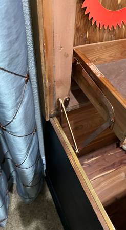 Great copper colored metal bars hold partitioned wood tray. Has held heavy glass items and easily opens and closes. Tray easily removes by lifting out. Felt nice in drawer-some tape residue to wood on sides. Approximately 47 inches long, 18.5 inch front to back, 28 inches tall. Beautiful inside.