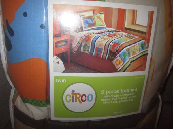 this is a New in Bag Circo Twin Reversible Animal Design 5 Pc Comforter Set Comforter has Animal Design on One Side, Stripes on The Other Side as Picture Shows Features: Animal Design 5 Piece Set...