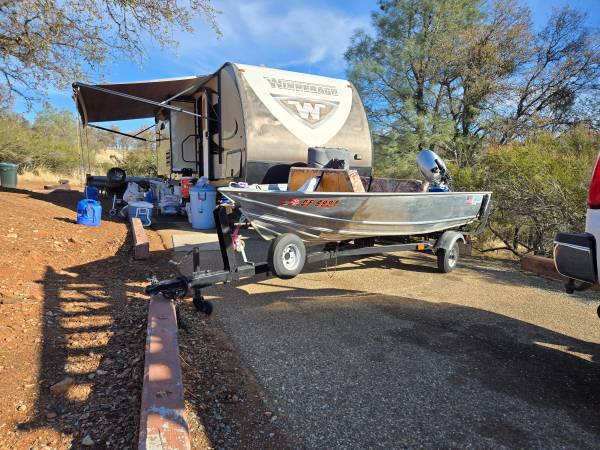 Hello this is a restored boat with 3 padded camo seats 2 fishing poles and comes with all NEW gear in its original packaging,2 new adult life vest c02 style and two new doggy life vests in new original packaging never worn,Panther motor lock and trailer tongue locking device. new interstate marine battery, 'used Minn Kota trolling motor, New Honda 9.9 cost 3,800 new power tilt with Honda motor cover, electric start 4 stroke power thrust and a used 2 stroke 6 hp two stroke Johnson seahorse worth 400$ that works perfectly. Hydraulic fold away lift cost 230$, 2 engine stands and Amsoil lube filters new tires and new axel cost 500$ from Krobuilt in reno with a spare new tire, new trailer wiring and lights and it is also a jet ski tilt trailer registered and ready and has Quagga mussel FREE certification for california tags for 2026 ... call show contact info