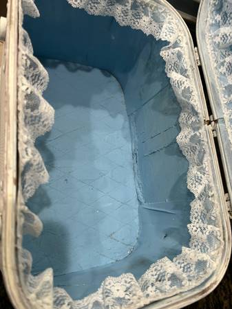 Mirror intact. See metal. Fun little storage suitcase for travel items, dancing shows. Inside corners glue dried and separated from sides, could add glue. Fun vintage luggage. Fun storage for barbies, toys, photographs. Makeup.