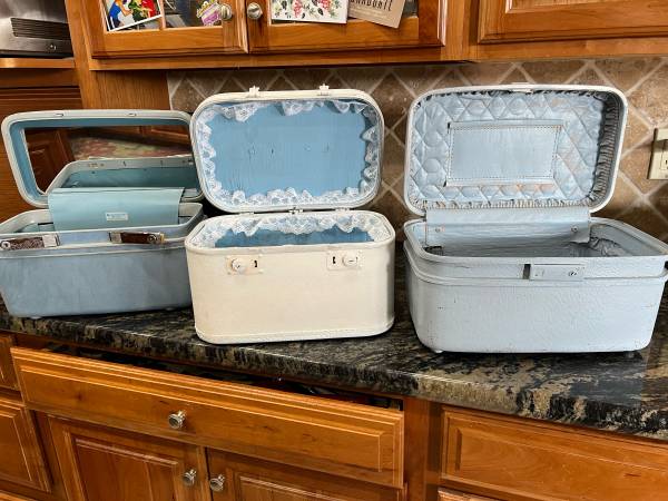 vintage fun travel suitcase cosmetics wedding bridal cards shabby cottage chic mid century