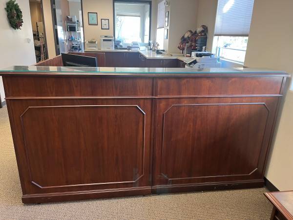 Solid wood L-Shaped receptionist or front office desk. Has fitted glass top (see pictures). Comes apart in three pieces for easier transportation. If you can come by our office and pick it up, it's...