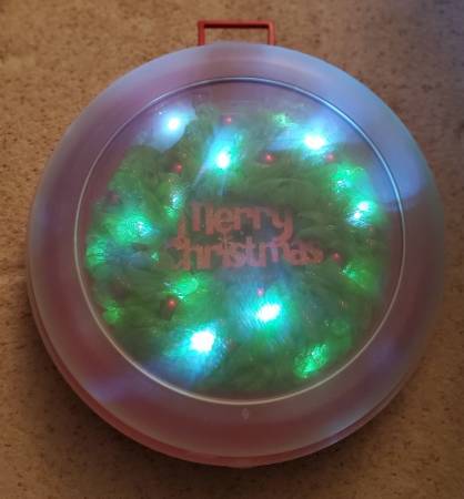 Approx. 18", a very full and thick wreath. Made from Green 'deco mesh' with a center wood plaque "Merry Christmas" and Christmas ball ornaments, with battery operated lights. I sold a ton of different wreaths on Etsy a couple years ago and this one sold for $125. I took photos of each wreath in different locations, angles and light and in a new 'Sterilite' case for $22. This was popular, because of the color, lighting and that it is one of the most durable wreaths to hang on your door during inclement weather.