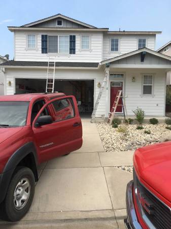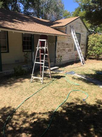 pressure wash complete exterior, scrape, sand, prime, patch/caulk where needed.