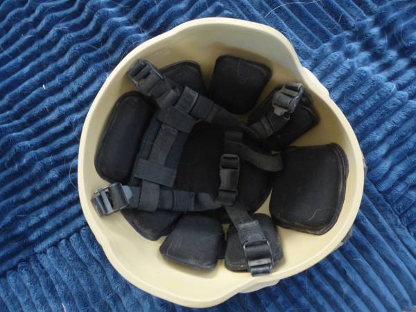 Desert tan Paintball Helmet. Size large with adjustable pads and head strap rigging. Never used. Has exterior Velcro and attachment points for lights or camera setup.