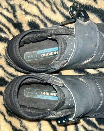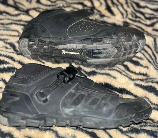 This is a pair of black Shimano SH-ME702 (ME7) trail/enduro mountain bike shoes with a speed-lace system and a Michelin outsole.