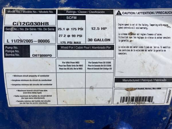 Gas powered air compressor, 12.5 hp kohler engine, electric start, 30 gallon tank. Runs good, asking $500