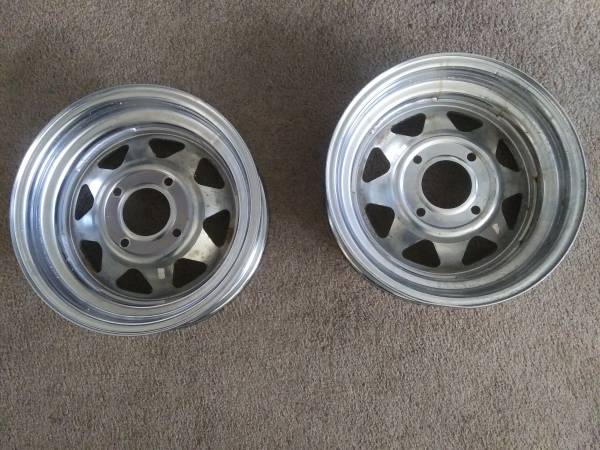 I have two 15x5 chrome four lug VW wheels for sale. The they have never had tires mounted on them and never been on a car. 130 mm bolt circle. Made in USA not China!Perfect for Baja front runners. $150. Call or text only.